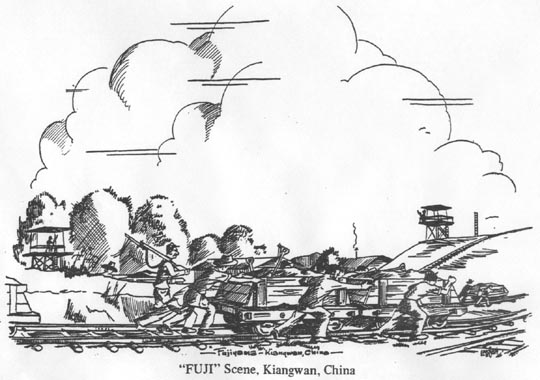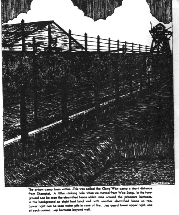 KIANGWAN, CHINA. Page 1 of 3 PRISONER OF WAR CAMPS IN AREAS OTHER THAN THE FOUR PRINCIPAL ISLANDS OF JAPAN KIANGWAN CHINA 1. LOCATION: The Kiangwan camp. built on high and dry ground, was transferred Irom Woosung on 6 Dec, 1942. It was located in the suburbs of Kiangwan North of Shanghai on Tazang Molor Road, perhaps an hour ride by car from Shanghai, A Japanese military airdrome was located about two miles from the camp on the North, and a civilian airdrome about four mites South. 2. PRISONER PERSONNEL: The capacity of this camp was 1,600 and the prisoner personnel was divided as follows: 700 American army, navy and marine corps, plus nationalities brought the camp up to its full complement. (Separate report 10 Sep 45 lists Marines from Peking/Tientsin, US forces Wake Island, US Air Forces in China, men from USS Wake, SS Malama, SS Vincent, SS President Harrison, Pacific Naval Air Bases contractor personnel on Wake, Pan-American Airways personnel-Wake, Liberty Mutual Life Insurance personnel-Wake, men from HMS Peterel and British merchant ships, men from Norwegian merchant ships, and Italian forces from shanghai and SS Count de Verde.) Col William Ashurst, U.S. Marine Corps, was the ranking officer, his executive officer was Maj, Luther Brown. 3. GUARD PERSONNEL: The camp Commandant was Col. Otera whose staff consisted of Capt, Shindo. LI Malsui and a Mr. Ishihara. 4. GENERAL CONDITIONS: Conditions at this camp were fair, and much better than at Woosung, which boosted morale. The prisoners spent their leisure lime in improving the campgrounds by planting flower and vegetable gardens, and laying out a sports field- see info on Mt. Fuji project mentioned later in the report and after the photos below. (a) Housing Facilities: The barracks, which were roofed with galvanized iron camouflaged with gray. green and blue paint, were surrounded by a live wire fence which was charged only at night, A stone wall, about 10' high, was located back of the fence and on top of that wall was another wired fence. The 7 barracks, which were about 200 yards long. with a capacity to accommodate approximately 250 prisoners each. were of flimsy construction but roomy and well lighted. (b) Latrines: The latrines were the usual Japanese type and were very crude and unsanitary until improved by the prisoners. They were separately built at one end of each barracks. (c) Bathing: Bathing facilities, with hot and cold water, were in separate barracks detached from living quarters. The water, which was inadequate during the summer months, came from a deep well. (d) Mess Hall: The kitchen was operated by the prisoners with a non-commissioned officer in charge. Kitchen arrangements were very crude and utensils were sadly lacking. Bread was baked in the bakery and was of good quality. (e) Food: Japanese issue was. for the most part. sufficient In quantity of a kind, while greatly tacking in quality. Meats and fats were negligible in quantity and poor in quality. Meals consisted largely of rice, vegetable stew, and small additions of meat - about 150 grams, mostly pork and fish, and 50 grams of bread and tea. The daily issue of Japanese food rations added up to about 2.150 calories, mostly carbohydrates. The paid working prisoners received 100% pro rata of the rations, the non-working prisoners about 80%. The ration was augmented by supplies from the Red Cross of ham. bacon and fresh fruit which assured each prisoner at least one substantial meal per day. (See below for Colonel Ashurst's notes to the War Department on food at Woosung and Kiangwan.) A special Christmas dinner in 1944, prepared in camp by the prisoners, was furnished by the International Committee of the Red Cross, consisting of vegetable soup. pot roast, boiled sweet potatoes, boiled carrots, hot rolls, coffee and pumpkin pie. The aid of the Red Cross organizations, plus vegetables from the camp garden made food conditions tolerable. (After the war Col Ashurst recommended Red Cross representative Mr. Egle for the Distinguished Service Medal for his work on the behalf of the POWs at Woosung and Kiangwan.)(f) Medical Facilities: No beds were provided in the hospital, which was first located at one end of a barracks, and which consisted of a few small rooms with no special arrangements. Separate bunks had been arranged by dividing the sleeping platforms. Later. 70 beds made available were transferred to the South side of the barracks so as to be less exposed to the cold. There was no artificial heat. The barracks were equipped with an infirmary, operating room, laboratory and a dental room. Medical supplies furnished by the Japanese, plus additional items donated by the International Committee of the Red Cross were, for the most part, adequate. The x-ray apparatus and other laboratory equipment was taken from Woosung by Capt. (then Commander) LC.Thyson. USN, the senior doctor. The general state of health was good. From 6 Dec. 1942 until May 1945 there were 22 deaths from natural causes. Malnutrition was the underlying cause of most of the sickness. Japanese authorities furnished all vaccines and insisted on frequent inoculations for Cholera, dysentery and typhoid, plus smallpox vaccinations. (10 Sep 45 report lists 22 deaths altogether at Woosung and Kiangwan. Only 13 actually occurred at Kiangwan. 16 Dec 42 PFC Robert I Wiskochil pneumonia, 9 Mar 43 civilian Joseph V Williams rupture of spleen, 23 May 43 civilian Lee P Driscoll gastric ulcer, 20 Oct 43 civilian John Garrison cancer of pancreas, 1 Jun 44 Pfc Ralph E Phipps pulmonary TB, 19 Aug 44 CPL Frank A Guthrie TB meningitis, 15 Sep 44 civilian Abner S Smith TB of spine, 19 Sep 44 civilian Geronimo Taijeron cancer of liver, 18 Nov 44 PltSgt Holland Cash appendicitis-acute gangrene, 29 Nov 44 First Sgt Paul R Agar cirrhosis of liver, 16 Dec 44 civilian John Ellinson (Ellassen ?)macroeltin anemia, 19 Jan 45 CPL Clyde E Roark TB of spine, 23 Mar 45 Sgt Alton J Bertels pulmonary TB. All military were USMC.) 